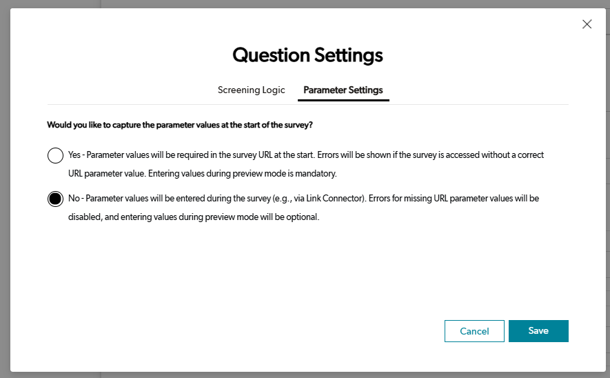 - Configure the URL Parameter question not to capture data at the start of the survey.