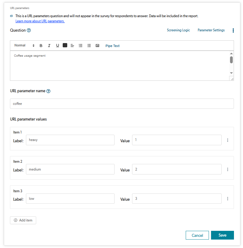 - URL Parameter questions will appear in survey data and reporting just like any other survey question.