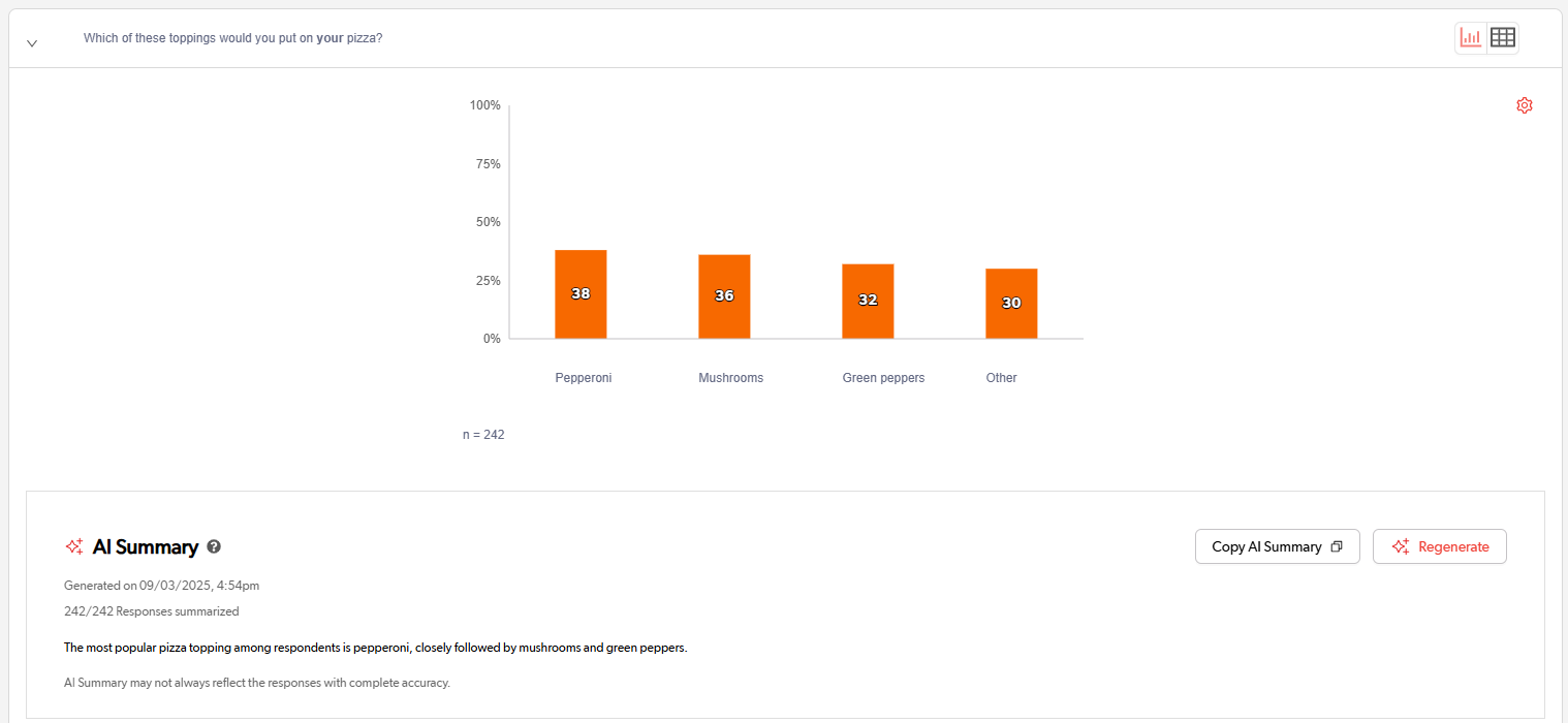 The AI Summary feature leverages OpenAI’s GPT-4o model, but rest assured, it only analyzes the responses within your project. The AI is exclusively for the specific question that it’s summarizing, delivering insights tailored to your survey.