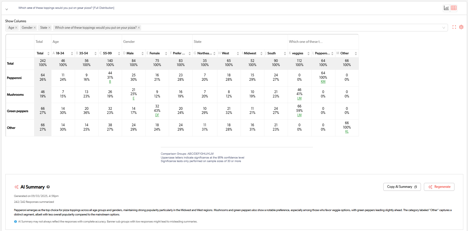3. Review the Results: The AI will generate a concise summary of key themes and points, making it easy to interpret feedback at-a-glance. You can also add filters or edit crosstab banners and re-generate the summaries to see responses from various combinations of respondents.