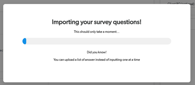 2. When “Import survey questions” modal appears, upload a file via drag and drop or browsing folders.