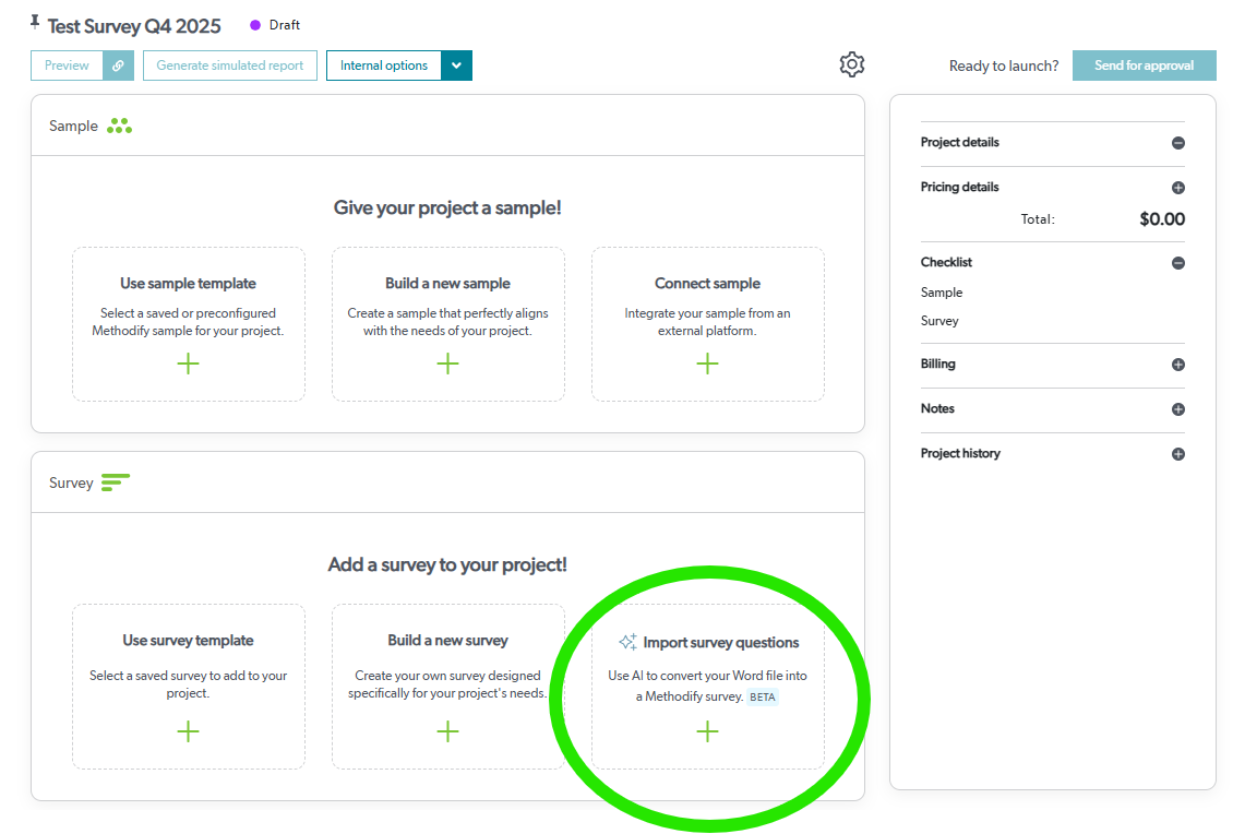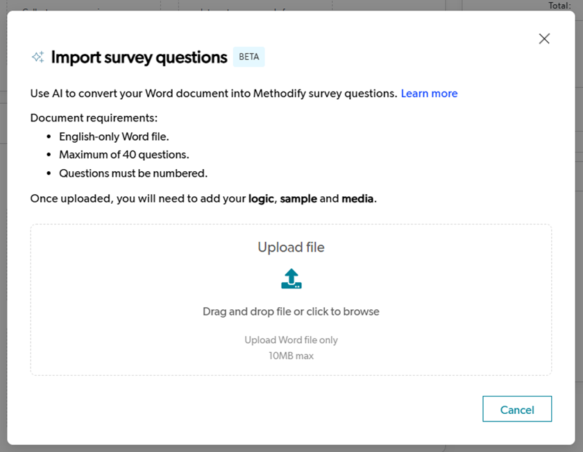 Save time by using AI to import questions into Methodify. Instead of typing or pasting survey questions and answers, simply import a Word file to a project and AI will identify the questions and answers in the document to create a survey in the Methodify survey editor. From there, you add sample, logic, and media before sending the project for launch.*