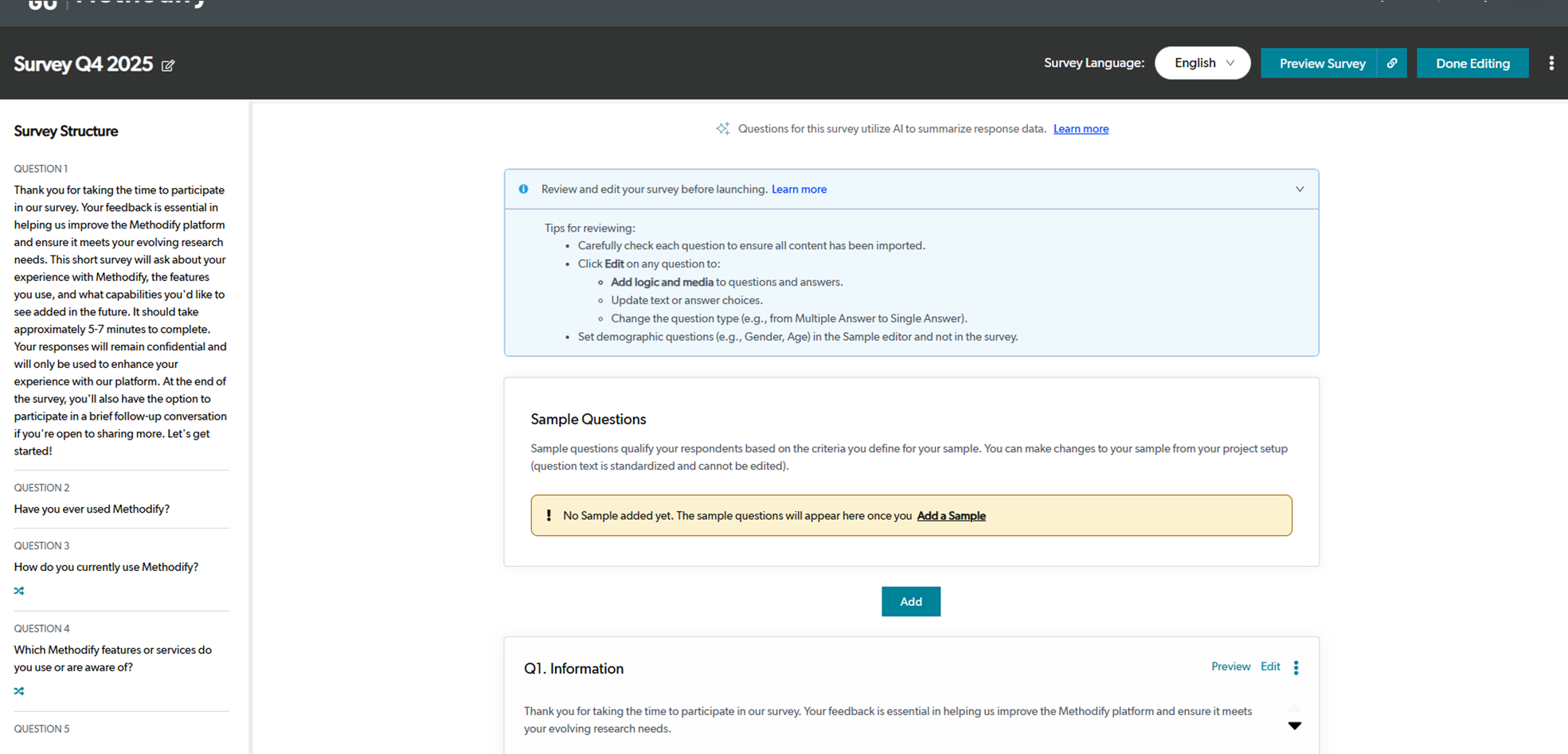 3. The document will be uploaded and the questions will be converted into the Methodify survey editor, where it can be reviewed and revised before being sent for launch.