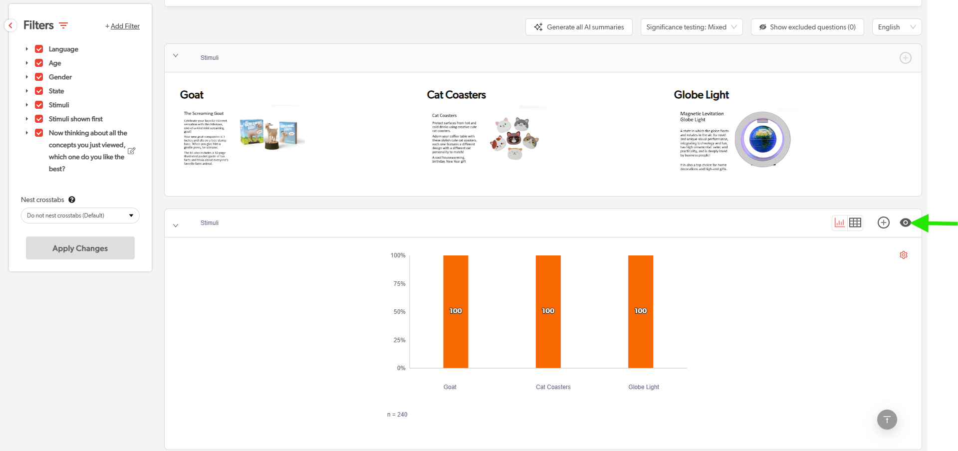 - Click the eye icon on the top right corner of the question you'd like to omit from your report and export.