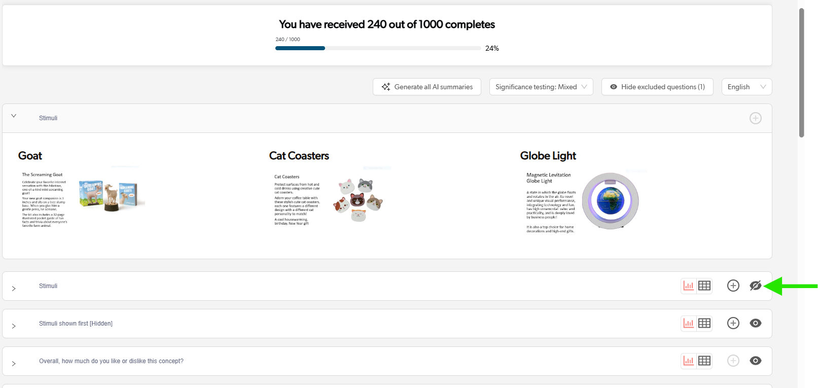 The hidden question(s) will appear with the eye icon crossed out, indicating these are the questions that are excluded from the exports.