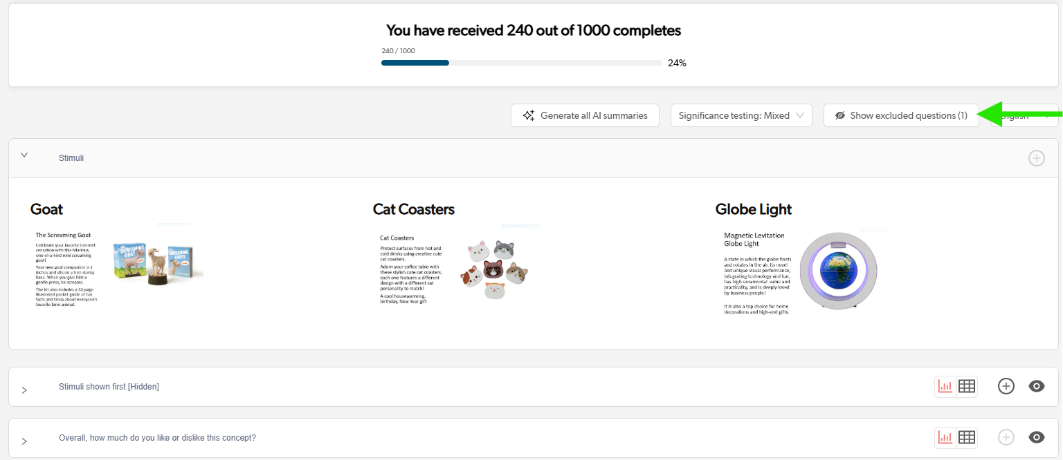 If you ever want to see questions that have been hidden, click the "Show excluded questions" button near the top of the report page
