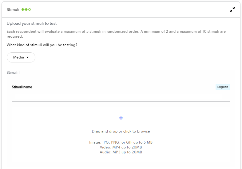 Select Media or Text from the dropdown, name your stimuli, and upload the file or enter the text you wish to test. The name that you give your stimuli is how it will be identified in your report.
